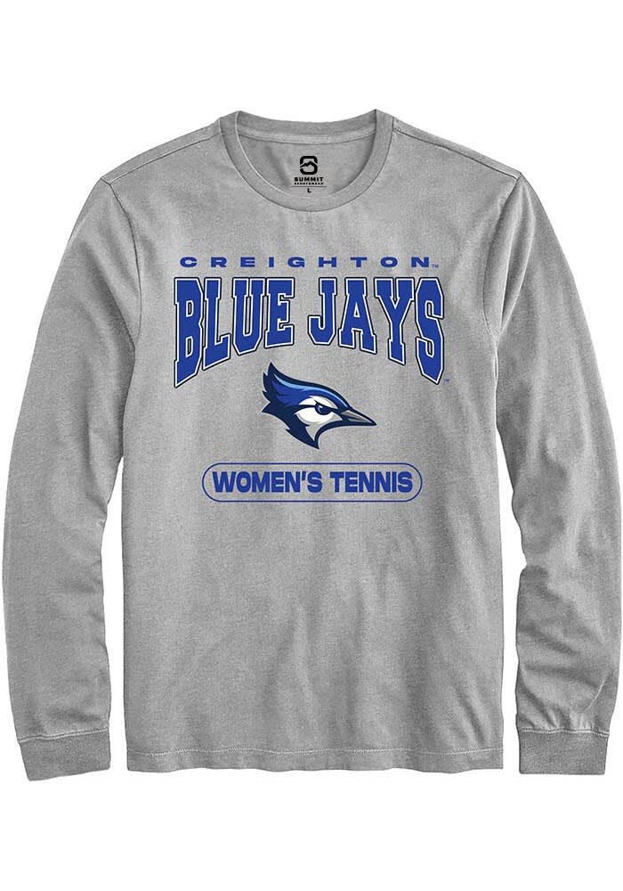 Show off your team pride in this Creighton Bluejays Grey Women's Tennis Long Sleeve T Shirt! This Creighton Long Sleeve Tee features a digitally printed graphic. Make sure everyone knows you root for the Bluejays with this Grey Creighton T Shirt. Go Bluejays!!