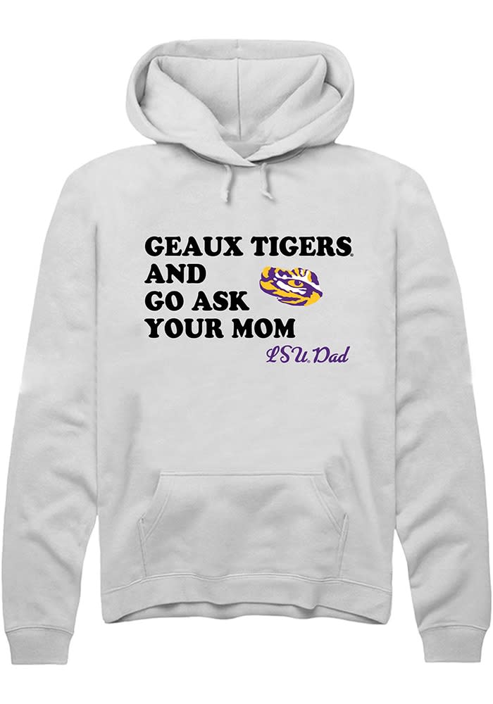 Put your Tigers spirit on display in this LSU Tigers Long Sleeve Hoodie! You'll be cozy on game day in this LSU Mens White Go Ask Your Mom Hooded Sweatshirt. This Tigers Long Sleeve Hoodie features a team graphic. Wear your LSU Tigers spirit with pride in this great Mens Hooded Sweatshirt!