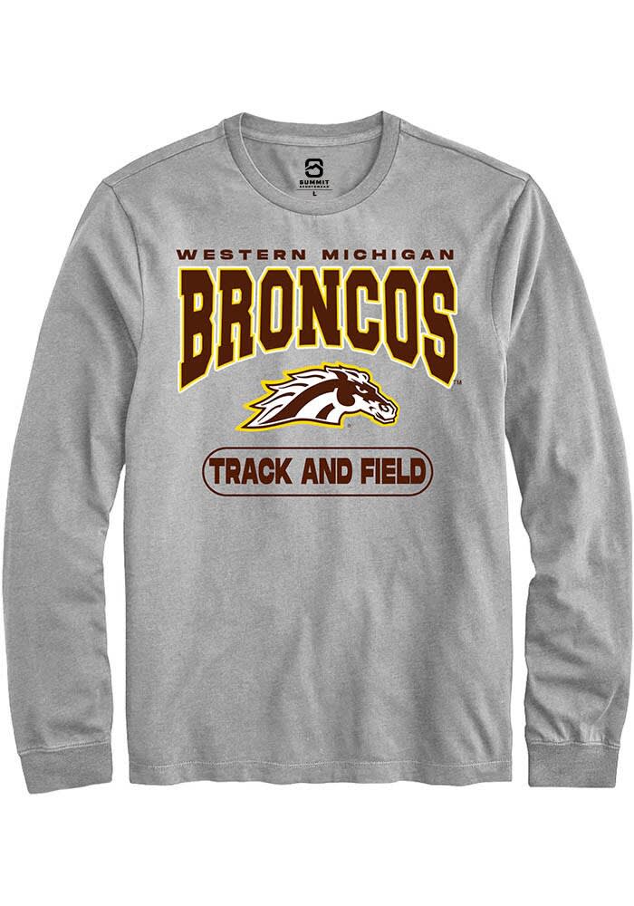 Show off your team pride in this Western Michigan Broncos Grey Track and Field Long Sleeve T Shirt! This WMU Broncos Long Sleeve Tee features a digitally printed graphic. Make sure everyone knows you root for the Broncos with this Grey WMU Broncos T Shirt. Go Broncos!