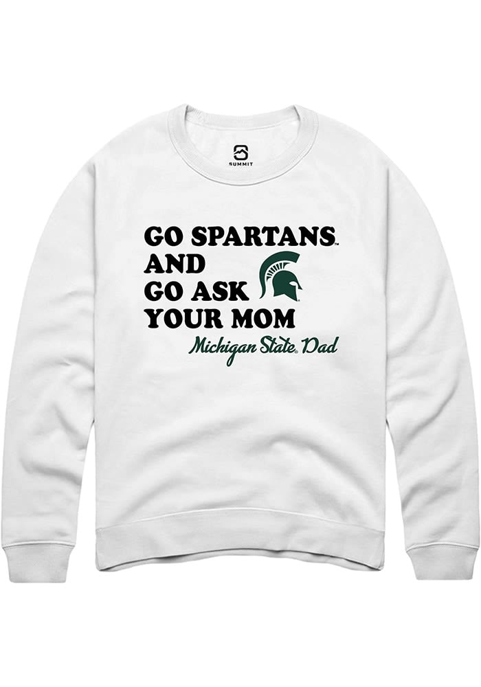 Head out in style with our Michigan State Spartans White Go Ask Your Mom Crew Sweatshirt! This Spartans Long Sleeve Crew Sweatshirt features a team graphic. You'll be warm, comfortable and stylish as you head to class, the game or just out on the town in this MSU Crew Sweatshirt.