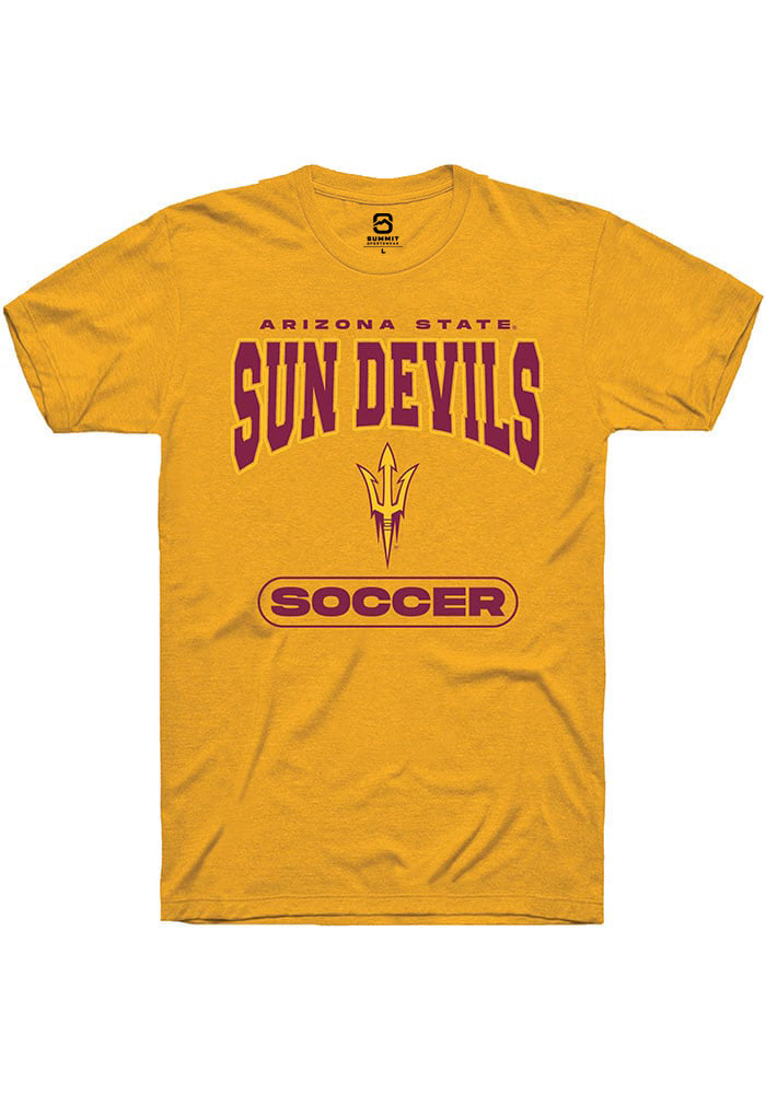 Show off your team pride in this Arizona State Sun Devils Gold Soccer Short Sleeve T Shirt! This Arizona State Short Sleeve Tee features a digitally printed graphic. Make sure everyone knows you root for the Sun Devils with this Gold Arizona State T Shirt. Go Devils!