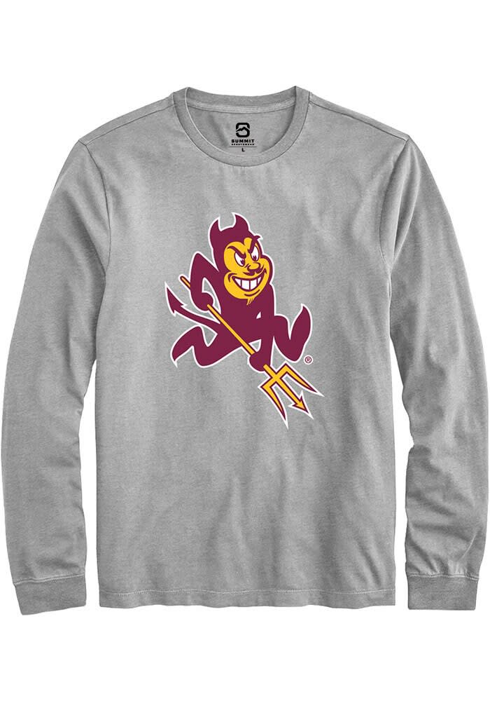 Show off your team pride in this Arizona State Sun Devils Grey Alt Logo Long Sleeve T Shirt! This Arizona State Long Sleeve Tee features a digitally printed graphic. Make sure everyone knows you root for the Sun Devils with this Grey Arizona State T Shirt. Go Devils!