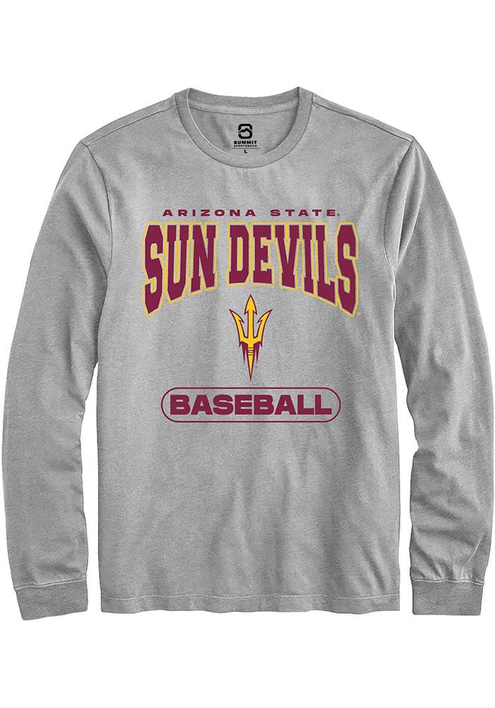 Show off your team pride in this Arizona State Sun Devils Grey Baseball Long Sleeve T Shirt! This Arizona State Long Sleeve Tee features a digitally printed graphic. Make sure everyone knows you root for the Sun Devils with this Grey Arizona State T Shirt. Go Devils!