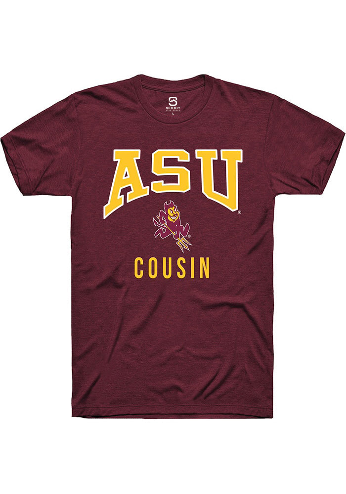 Show off your team pride in this Arizona State Sun Devils Maroon Cousin Short Sleeve T Shirt! This Arizona State Short Sleeve Tee features a digitally printed graphic. Make sure everyone knows you root for the Sun Devils with this Maroon Arizona State T Shirt. Go Devils!