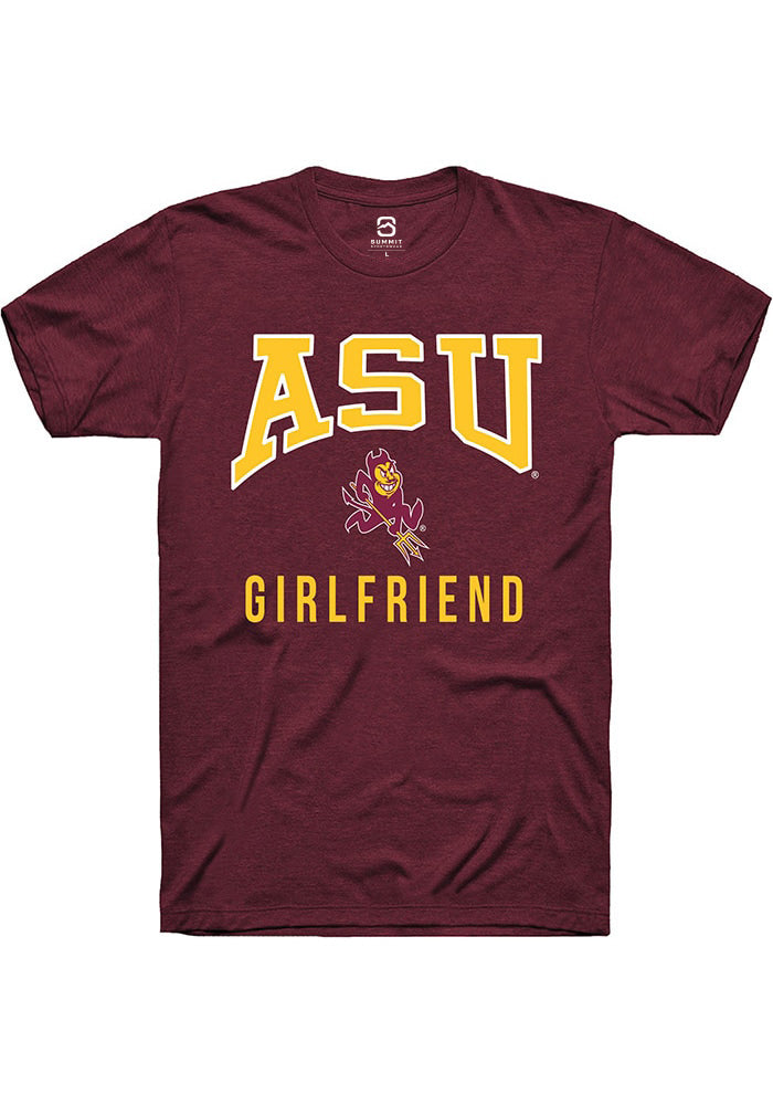 Show off your team pride in this Arizona State Sun Devils Maroon Girlfriend Short Sleeve T Shirt! This Arizona State Short Sleeve Tee features a digitally printed graphic. Make sure everyone knows you root for the Sun Devils with this Maroon Arizona State T Shirt. Go Devils!