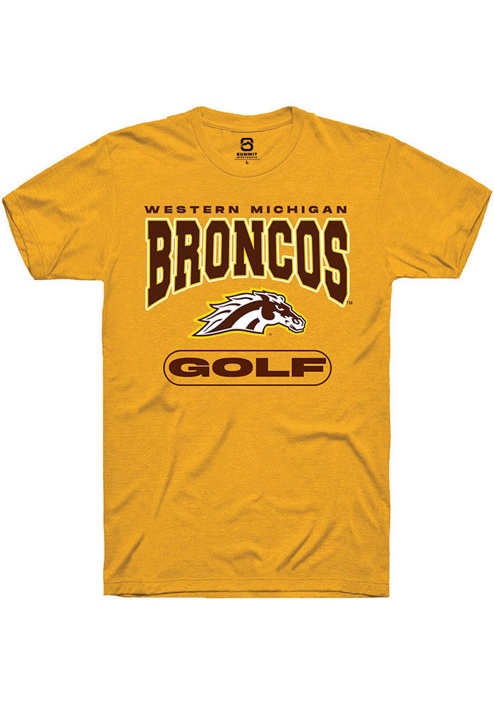 Show off your team pride in this Western Michigan Broncos Gold Golf Short Sleeve T Shirt! This WMU Broncos Short Sleeve Tee features a digitally printed graphic. Make sure everyone knows you root for the Broncos with this Gold WMU Broncos T Shirt. Go Broncos!