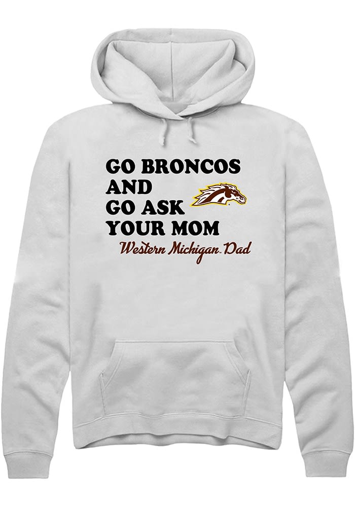 Put your Broncos spirit on display in this Western Michigan Broncos Long Sleeve Hoodie! You'll be cozy on game day in this WMU Broncos Mens White Go Ask Your Mom Hooded Sweatshirt. This Broncos Long Sleeve Hoodie features a team graphic. Wear your Western Michigan Broncos spirit with pride in this great Mens Hooded Sweatshirt!